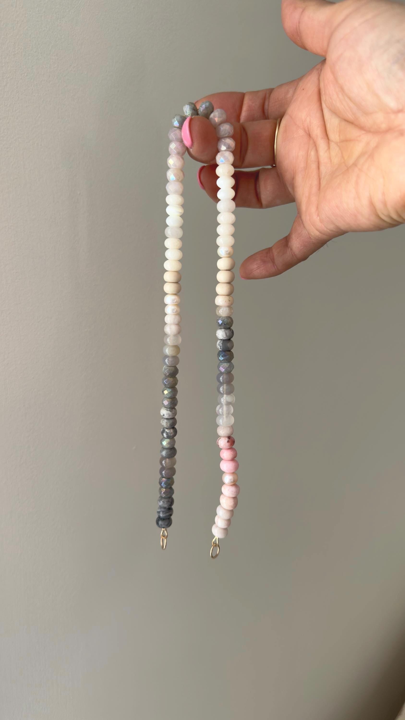 Glimmer “Gray 3” Necklace, one of a kind ombré gemstone necklace, Emerge Collection: soft grays, creams, pale blush, tough of sparkle.